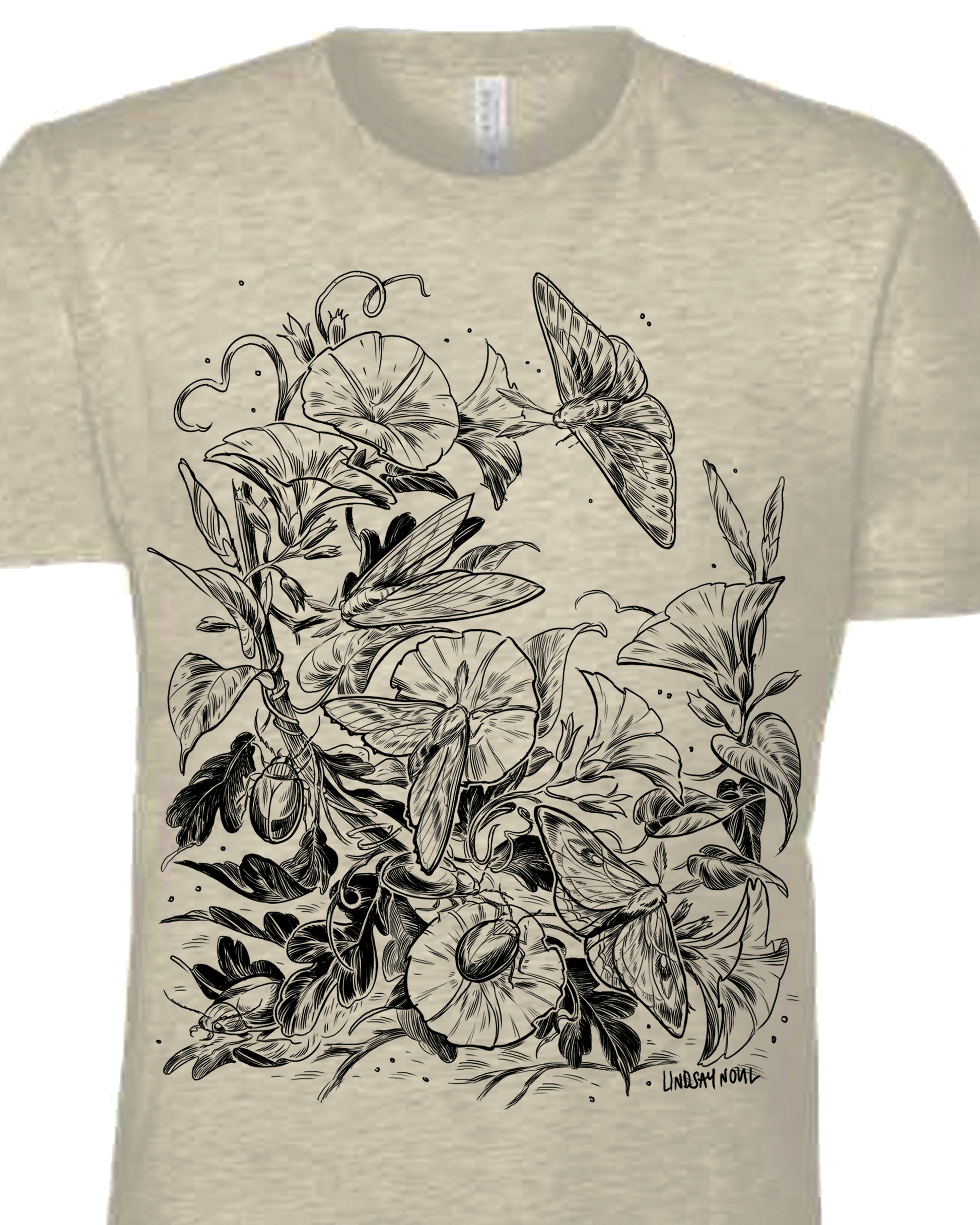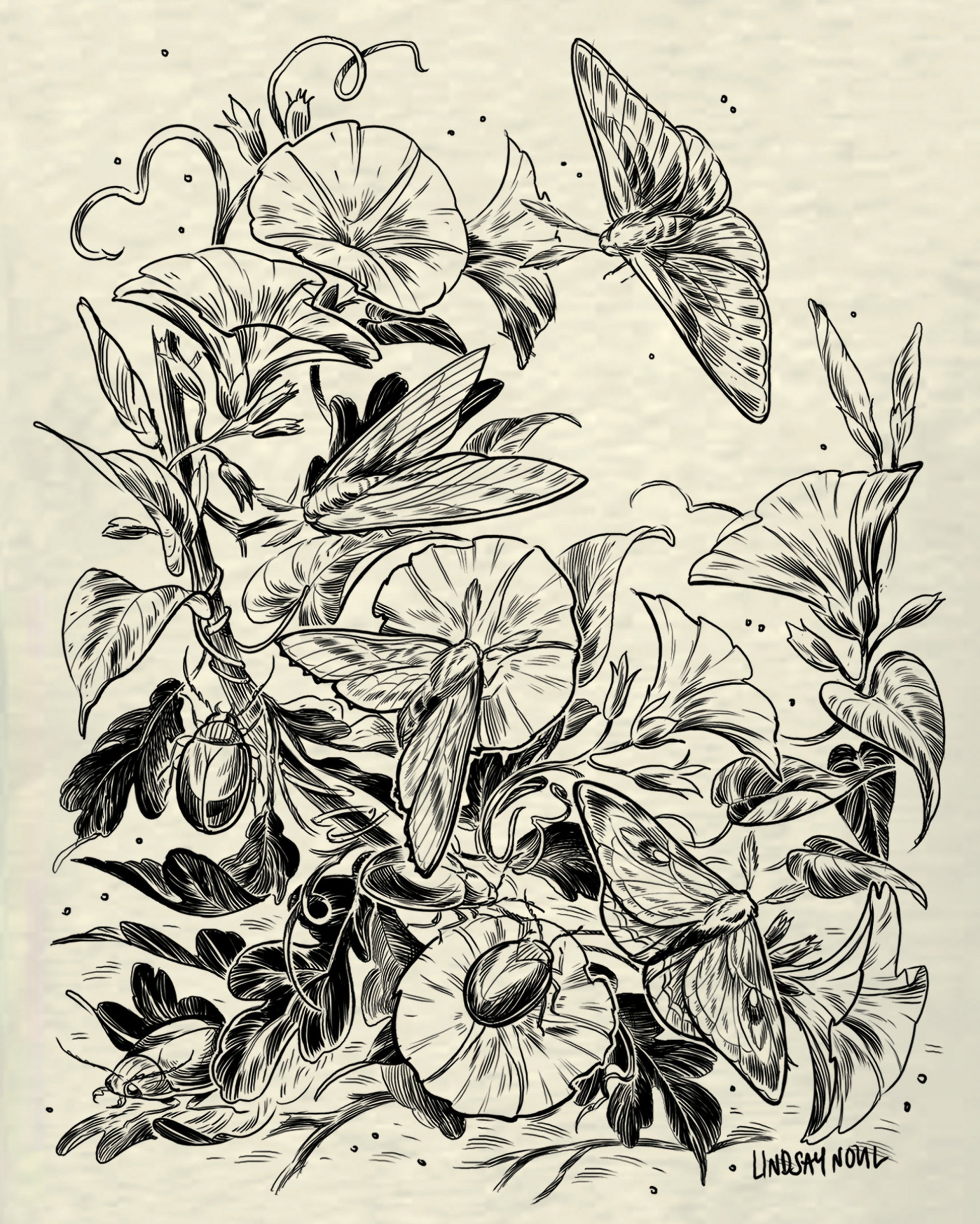 Slow down and appreciate the little worlds within our worlds with me. This design features moths and beetles enjoying the morning glories.